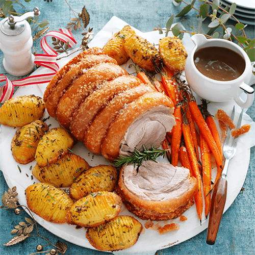 Roast pork shoulder with Hasselback potatoes, glazed carrots & easy gravy