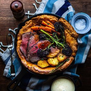 Drizzle a little oil into an oven-proof frying pan and put it in the oven. Add a bit of oil to a roasting tin and place in the oven to heat. Carefully, tip the potatoes into the roasting tin, ensuring they’re all coated with oil, add the carrots, parsnips and Broccolini. Put the tin back in the oven. Pour the batter into the frying pan and put it back in the oven and cook for 25 minutes.