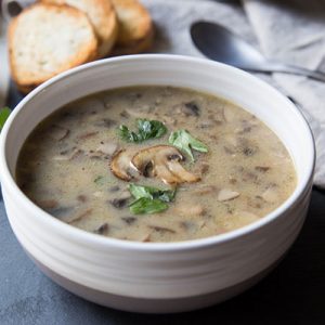 Return soup to pot and stir in cream. Season with salt and black pepper and serve in bowls, garnished with reserved mushroom slices and a few thyme leaves or chopped parsley.