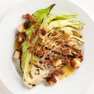 Drizzle cabbage with oil; season with salt and pepper. Grill over medium heat, turning occasionally, until tender and lightly charred, 15–18 minutes. Serve topped with vinaigrette and croutons.