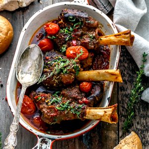 Return the lamb shanks to the pan, together with any meat juices on the plate. Make sure the shanks are well-submerged in the sauce. Place the lid on the pan, and place the pan into the oven for 2 hours to braise. Check the pan every 30 minutes or so to give it a stir.