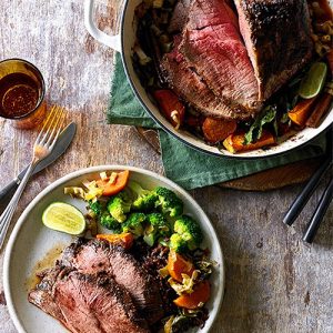 Remove tray from oven and gently toss vegetables. Reduce oven to 180°C (160°C fan-forced) and cook for another 60 minutes for medium rare, covering with foil if overbrowning. Place beef on a plate, covered loosely with foil and rest for 10 minutes. Slice thinly.