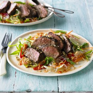 Mix the dressing ingredients together, pour over the noodles and toss through. Add the picked mint, coriander, salted peanuts, and pepper. Peel the carrots into ribbons and slice the chilli and spring onion to garnish.