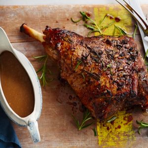 Put the onion wedges into a roasting tin, sit the lamb on top and roast for 1 hour. Pour 200ml of the port and 300ml water into the tin and return to the oven for 30 minutes.