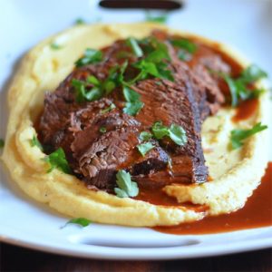 Turn off the stove top, put the lid on the pot and place the pot in the preheated oven. Cook for about 4-5 hours in the oven until the beef falls apart. Check for seasoning, adding the teaspoon salt if needed.